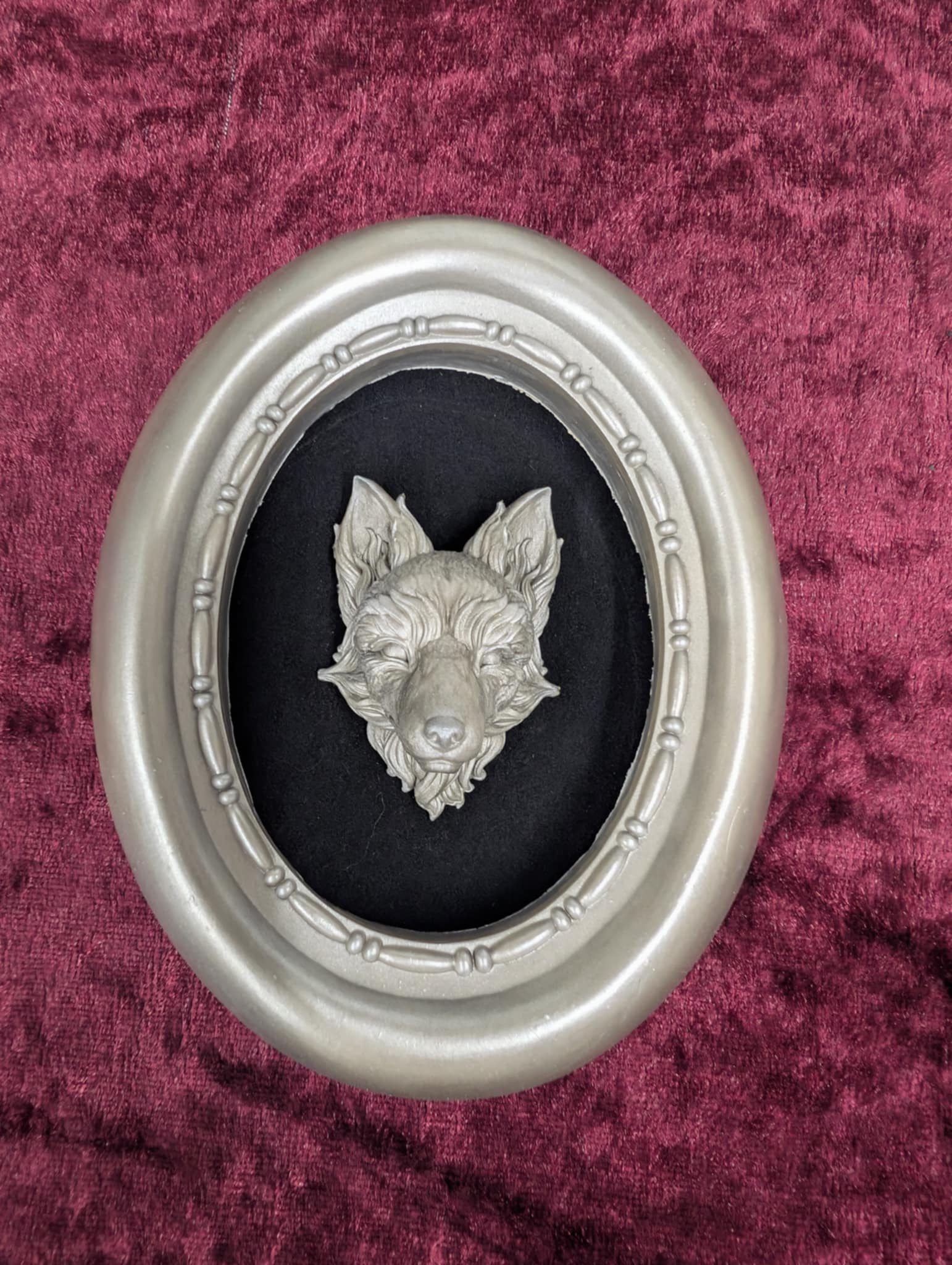 Finished in either Bronze, Gold or Silver with a black velvet-style background. It blends gothic elegance with woodland charm.