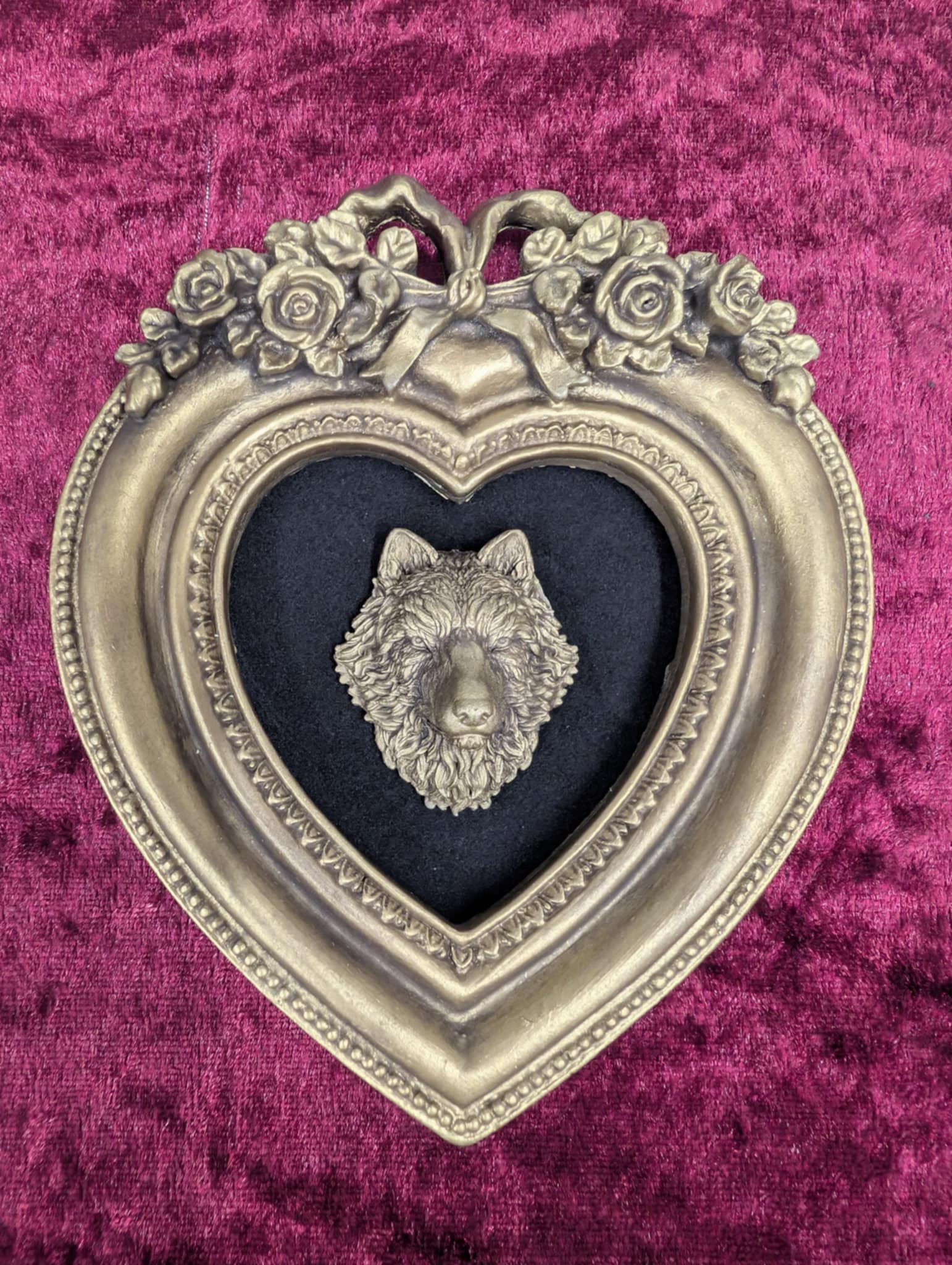 Finished in either Bronze, Gold or Silver with a black velvet-style background. It blends gothic elegance with woodland charm.