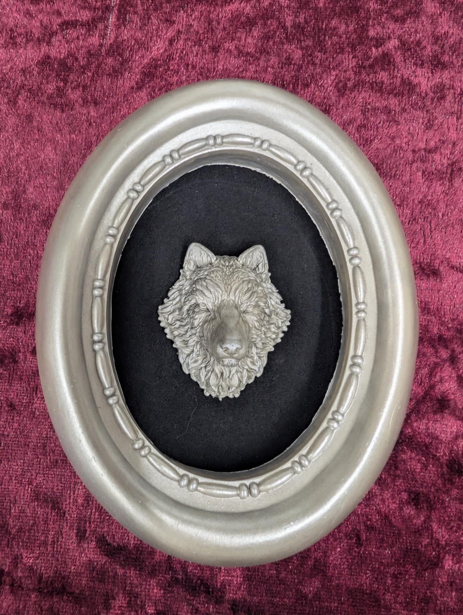 This unique wall art features a beautifully detailed Wolf head mounted inside an ornate frame.