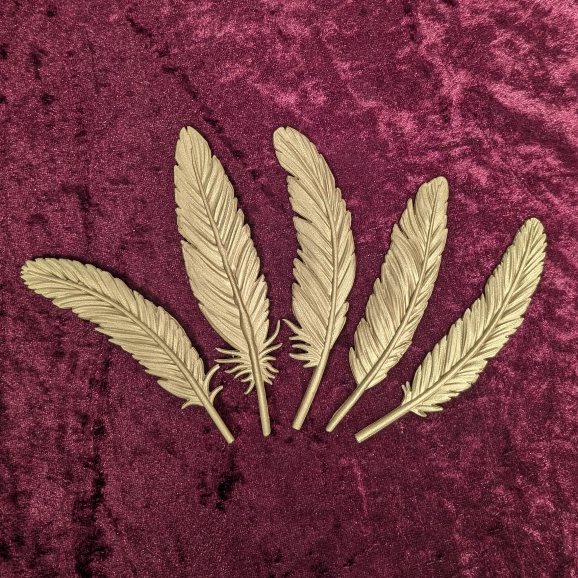 Add a touch of elegance to your space with these handcrafted set of 5 gold resin feathers.